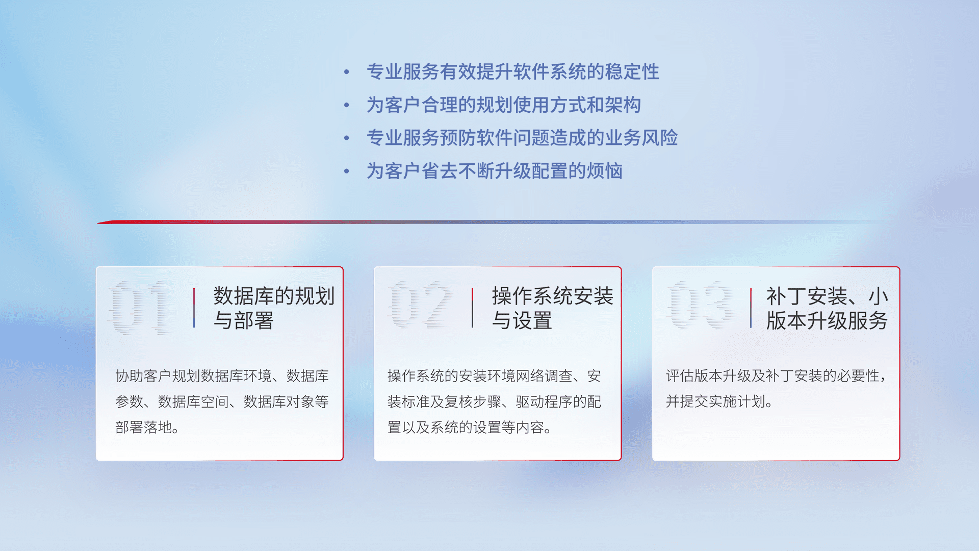 为客户提供软件规模升级、、快速部署、、、、按需配置的专业服务,,,,从数据库的规划与部署到操作系统的安装与设置,,,再到补丁安装和小版本升级提供支持。。。。