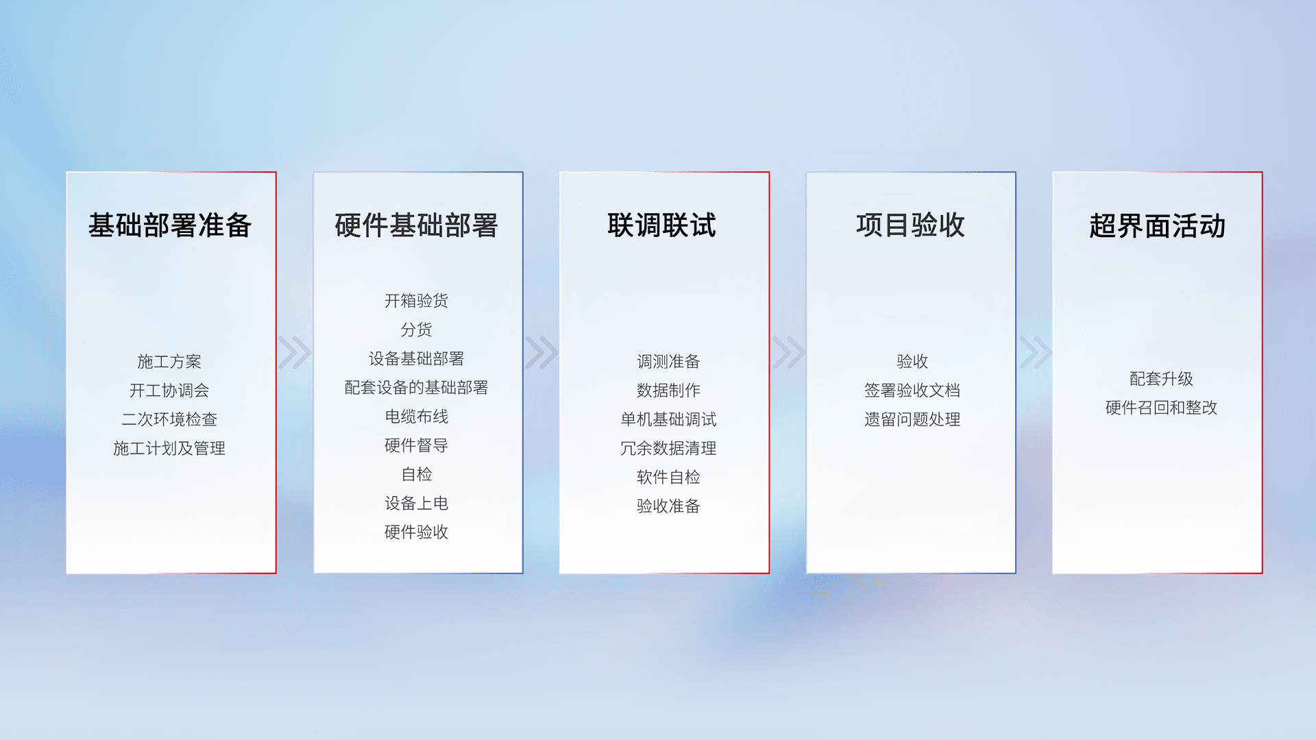 从基础部署准备、、、硬件基础部署、、、、联调联试、、、、项目验收、、、、越界面活动的全过程可追溯,,,,保证施工质量和进度。。。